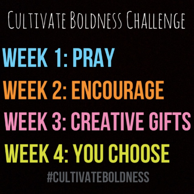 We are going to have our very first Cultivate Boldness Challenge starting January 4, 2015!! The CB Challenge is going to be 4 weeks long and the purpose is to help you step out in boldness to make stepping out part of your everyday life! The challenge is broken into 3 categories: praying, encouraging, and creative gifts.